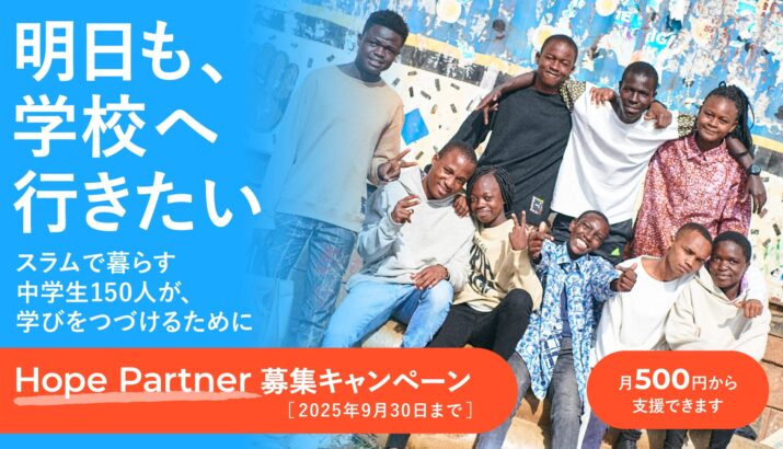 ケニアの首都ナイロビにある巨大スラム・キベラで暮らす150名の中学生が毎日学校に通って、学びをつづけられるように。継続寄付の仲間〈ホープ・パートナー〉を募集しています。