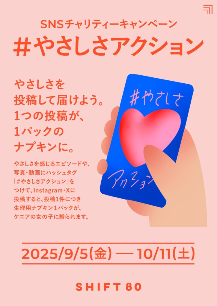 1件の投稿につき、生理用ナプキン1パック分に相当する寄付を協賛企業が提供し、NPO法人SHIFT80を通じて困難な状況にある女の子たちに生理用ナプキンをプレゼントできる取り組みです。SHIFT80が主催し、9月5日の国際チャリティー・デーから10月11日の国際ガールズ・デーにかけて実施しています。